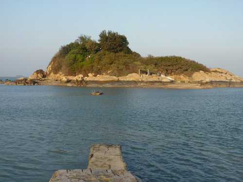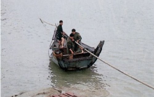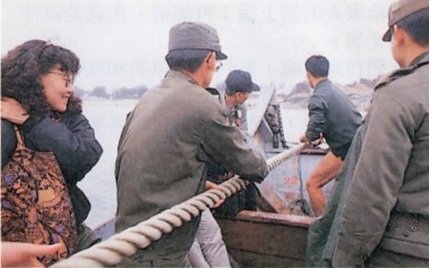 人員上下島及運補以人力挽著纜繩帶動小舢舨,照片中之女士為勝利之光撰文者.