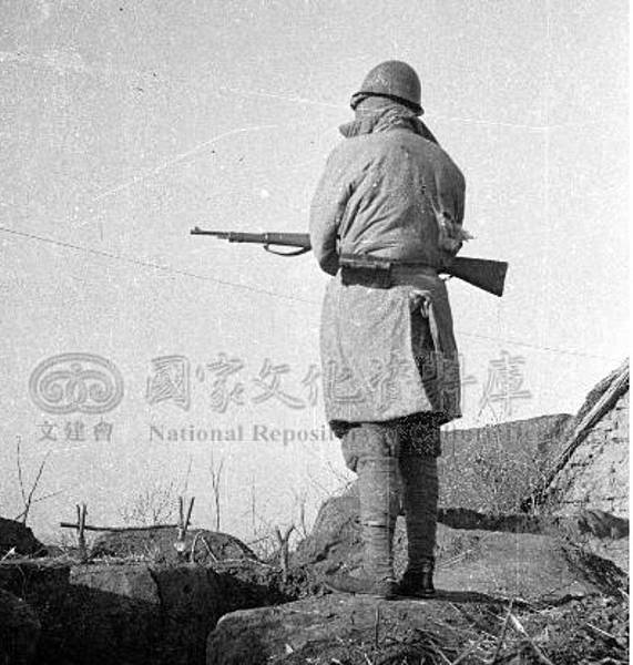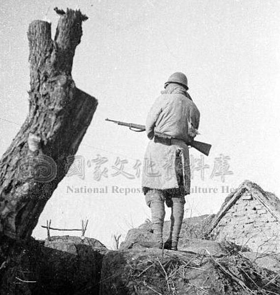 警戒中的士兵.手上端的槍為國造79式步槍(中正式步槍).頭上戴的是日式鋼盔,腳上穿的
