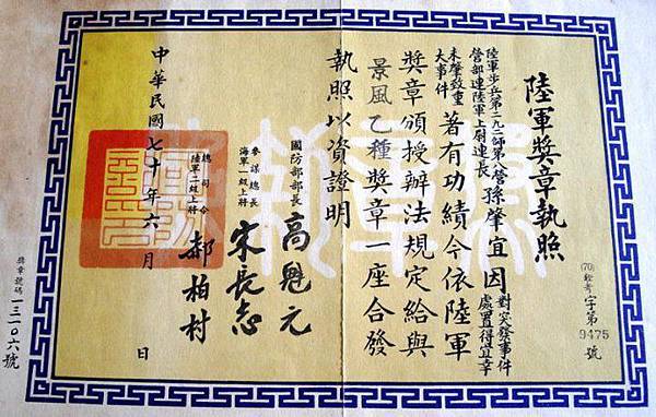 1981年金門金東師上尉連長任內,榮獲總司令郝柏村召見並頒發景風乙種獎章。
