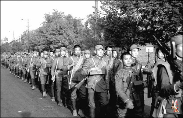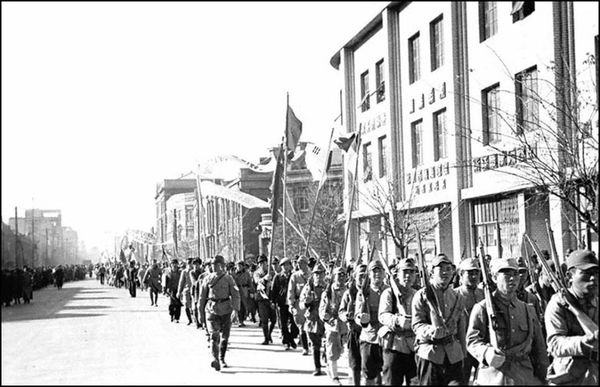 這是在瀋陽武裝遊行的共軍,蘇軍撤走後,共軍擊敗輕微抵抗的保安隊後進入市區耀武