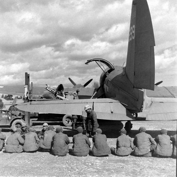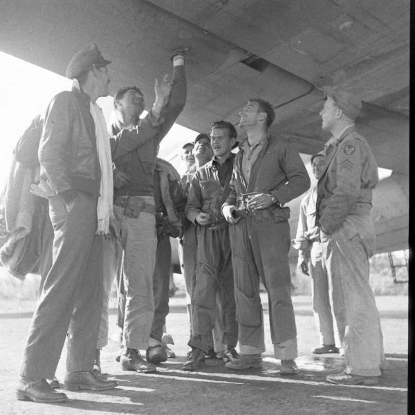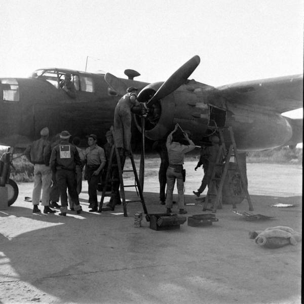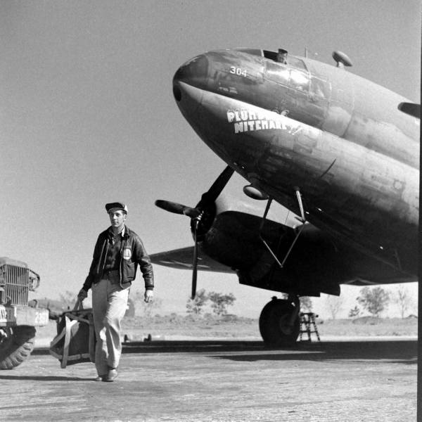 維護中的B-24轟炸機,飛行員身上穿著大家熟知的"血幅".