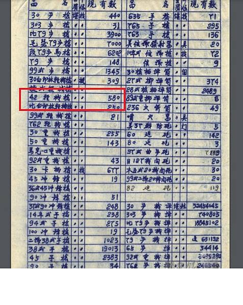 好友張先生提供之1950年國軍械彈庫存表,表中可看到42輕機槍580挺.