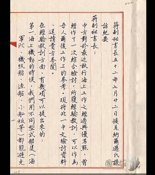 1963年時任國防會議副秘書長的蔣經國先生與美軍在台情報單位負責人納爾遜