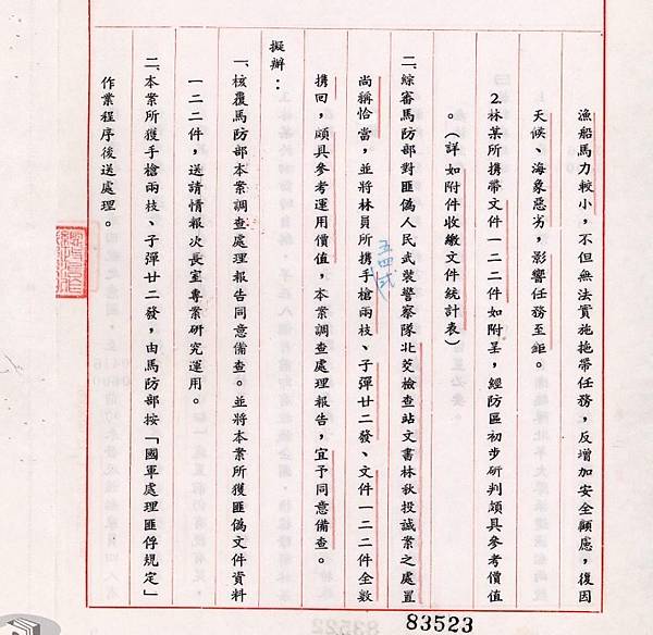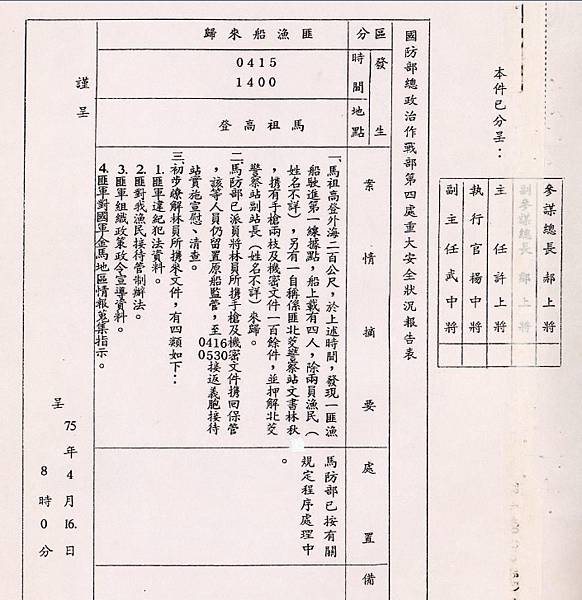 我方處理經過,收繳了攜帶的文件及槍枝後返馬祖,而將欲投誠者留在原船上,投誠者無