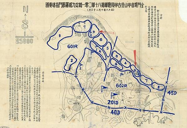 201師601及602團防禦陣地圖,由於缺乏材料,第一線的陣地都是土木工事,守軍盡可能張羅