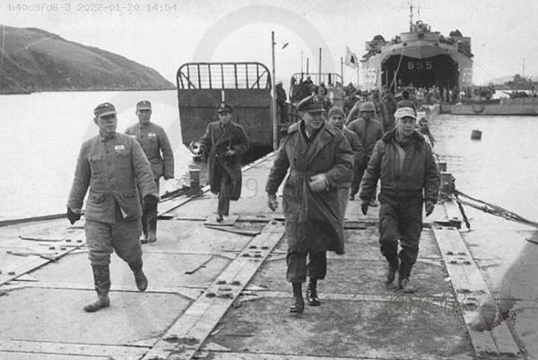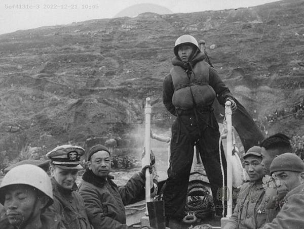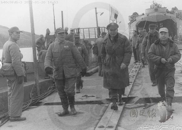 搭艦抵達大陳島,視察大陳軍民撤退情況,大陳指揮官劉廉一將軍親往碼頭迎接