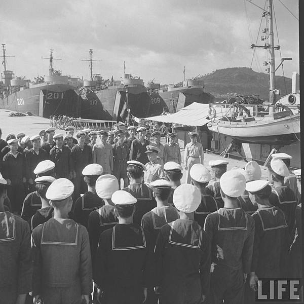 在碼頭上的海軍官兵.後方靠泊著三艘中字號運輸艦.