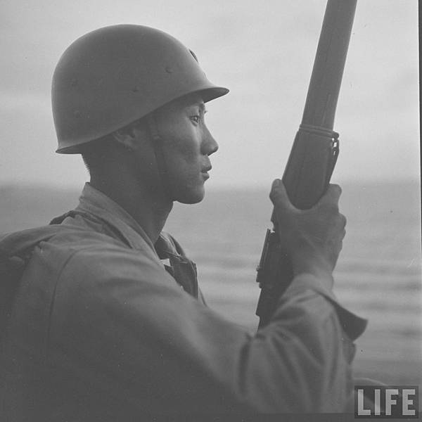 持30步槍戴著M1內盔的哨兵,可辨識內盔上崁著國徽.