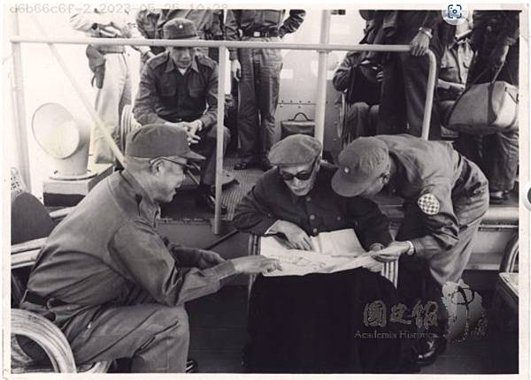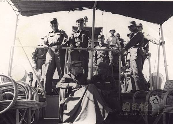 站在蔣先生後方者為當時金防部司令劉安祺,.陪坐者應該是當時駐軍第33師師長賈維