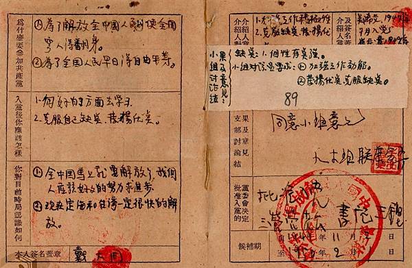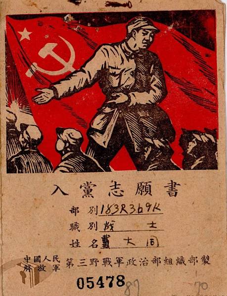 共軍入黨證.圖繪的共幹作出邀請手勢.